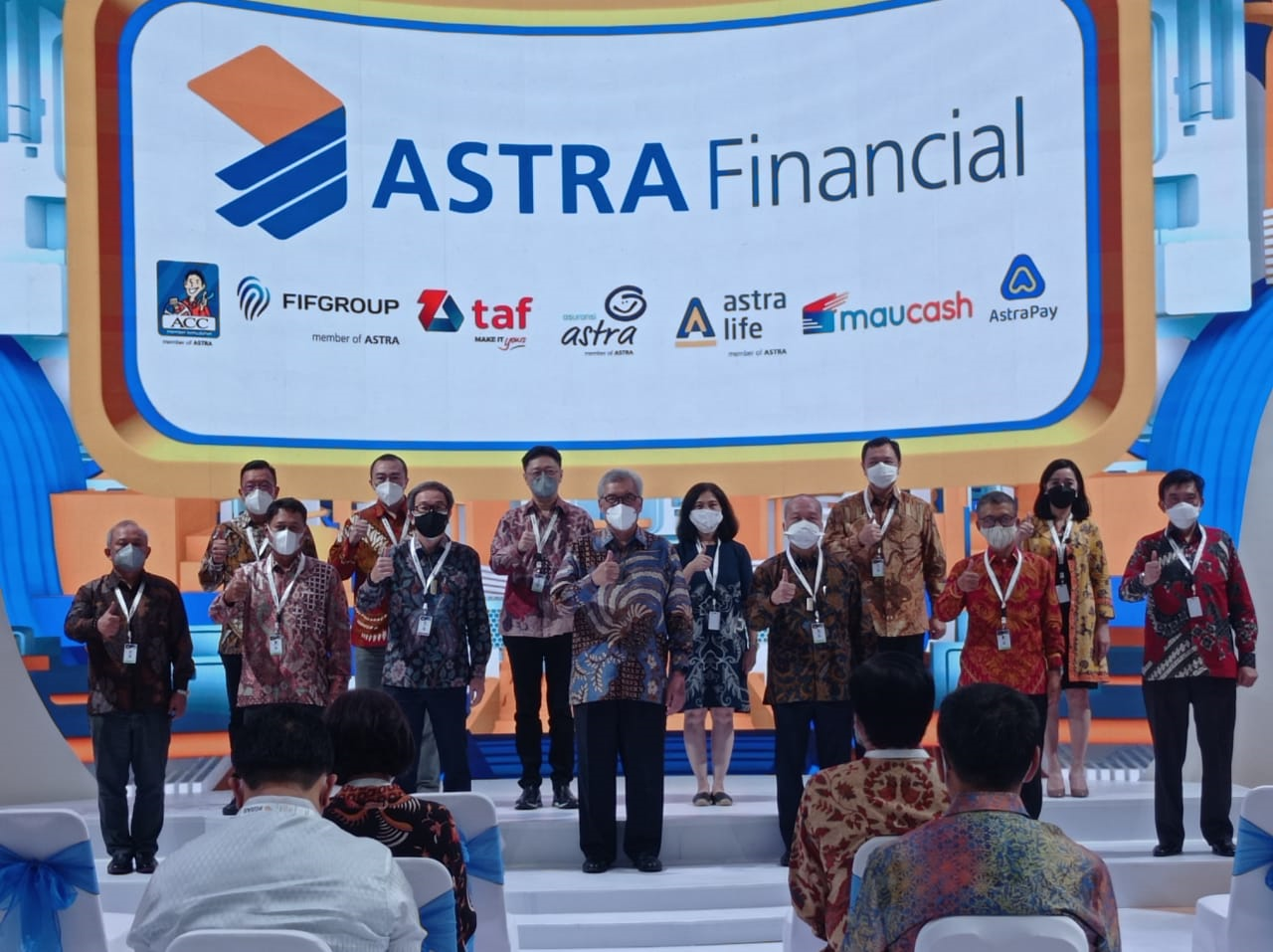 Presiden Komisaris Astra Priyono Sugiarto, Kepala Eksekutif Pengawas Industri Keuangan Non Bank merangkap Anggota Dewan Komisioner Otoritas Jasa Keuangan Riswinandi, dan Direktur Astra yang sekaligus menjabat sebagai Director in Charge Astra Financial & Logistic Suparno Djasmin, berfoto bersama dengan segenap jajaran direksi Astra Financial & Logistic di booth Astra Financial & Logistic pada GIIAS 2021, Kamis, 11 November 2021.