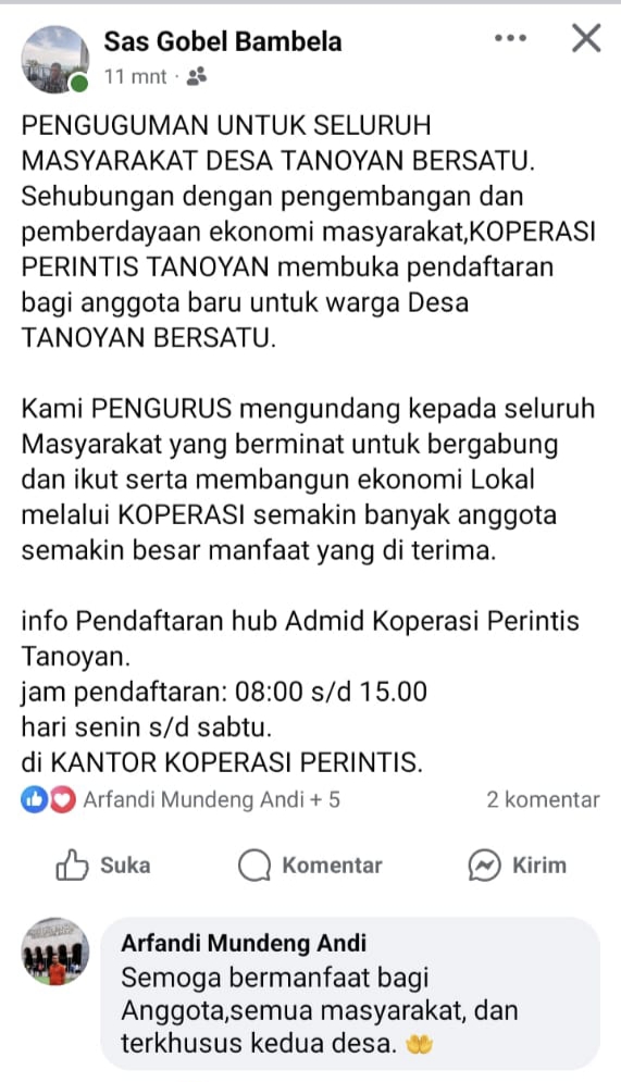 Dalam unggahannya, Sasmiran dengam nama akun facebook Sas Gobel Bambela, menyampaikan bahwa Koperasi Perintis Tanoyan membuka kesempatan bagi seluruh warga Desa Tanoyan Bersatu untuk bergabung menjadi anggota koperasi.