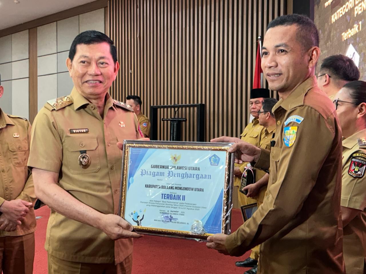 Capaian tersebut ditandai dengan penyerahan piagam peghargaan oleh Wakil Gubernur Provinsi Sulawesi Utara, Viktor Mailangkay kepada Pemda Bolmut yang diterima langsung oleh Wakil Bupati Aditya Pontoh, Selasa (07/10/2025) di Hotel Aryaduta, Kota Manado.