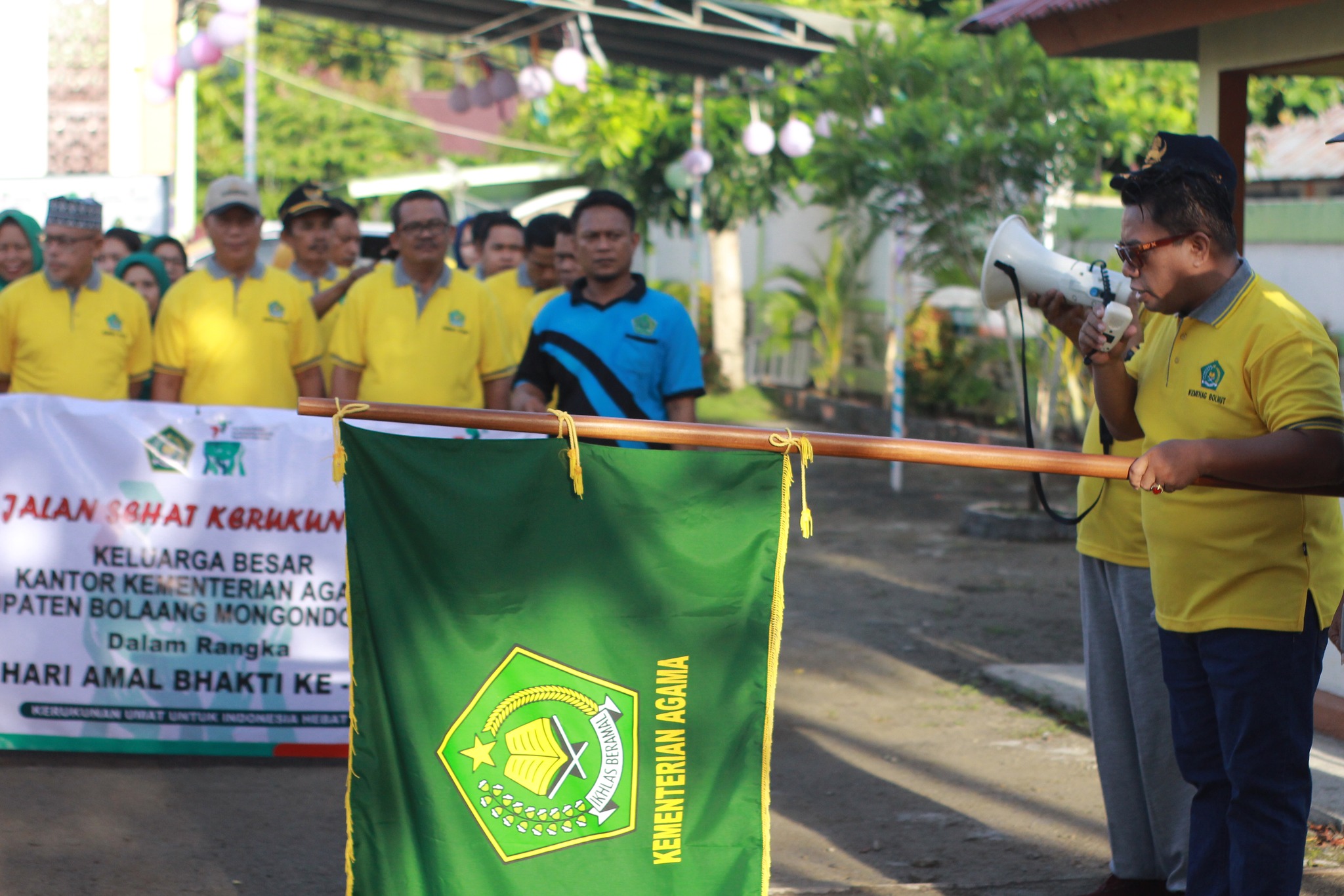 Jalan sehat dilaksanakan pukul 07.00 Wita dengan mengambil titik start di halaman Kantor. Kepala Kantor Idrus Sante melepas peserta jalan sehat yang diikuti seluruh Warga Kemenag dilingkungan Kantor Kemenag, KUA dan Madrasah, Penyuluh Agama Islam dan Kristen Non PNS, FKUB, serta sejumlah Ormas Keagamaan.
