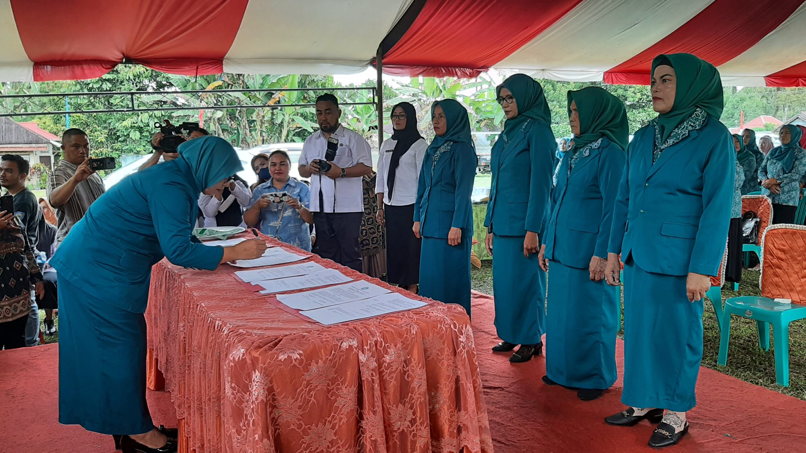 Ketua TP PKK Kecamatan Passi Barat saat menandatangani berita acara pelantikan TP PKK empat Desa.